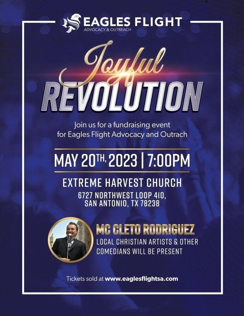 Joyful Revolution Concert & Comedy Show Reserve Your Spot Now! Join us for our Joyful Revolution Concert & Comedy Show Fundraising event for Eagles Flight SA. Ticket price includes appetizer and the show. Gold and Platinum Event Sponsorships also available. May 20th, 7:00 pmExtreme Harvest Church6727 NW Loop 410, SA TX 78238