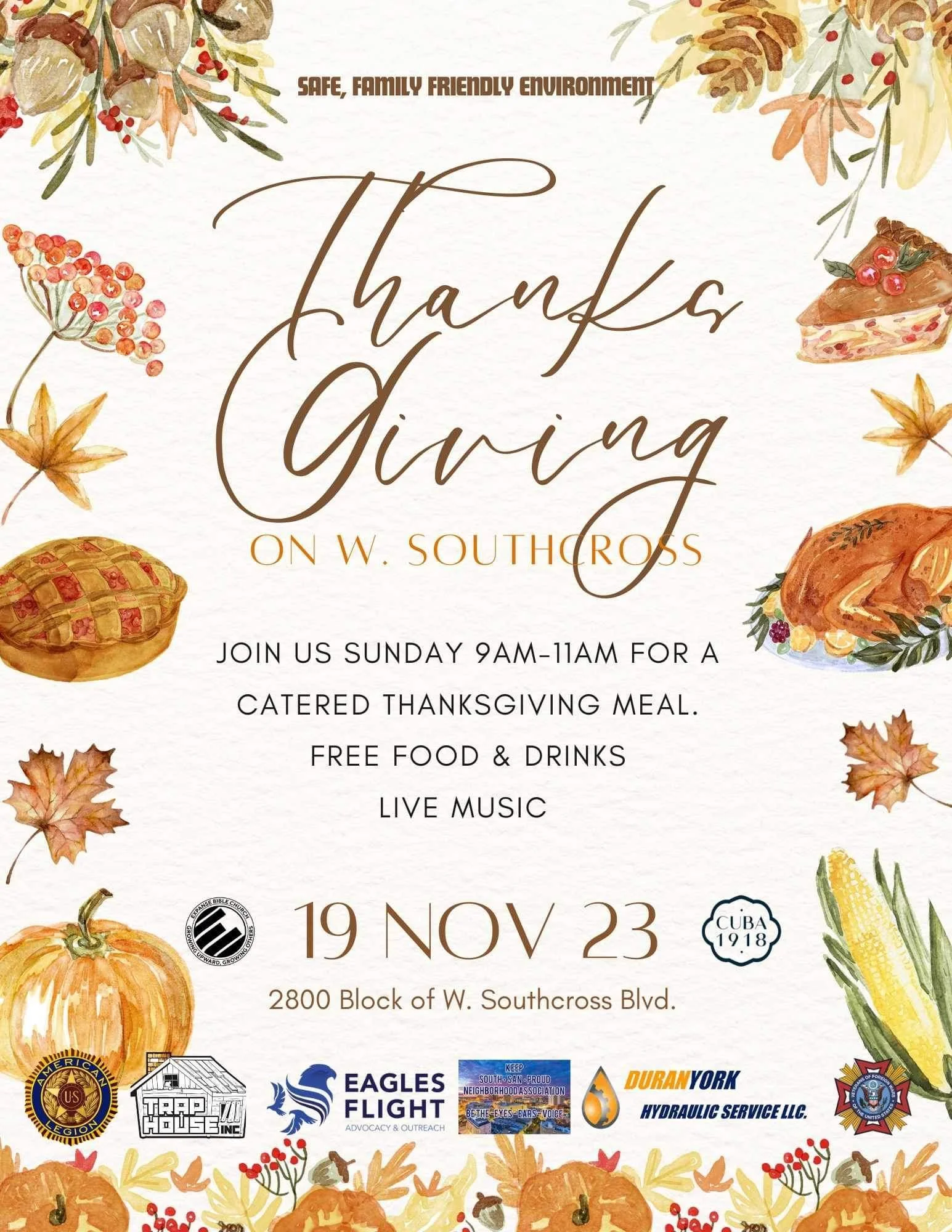 There will be free food and drinks, live music and a catered Thanksgiving Meal.